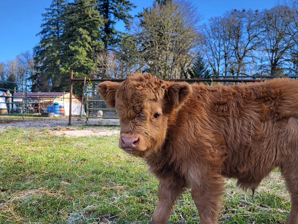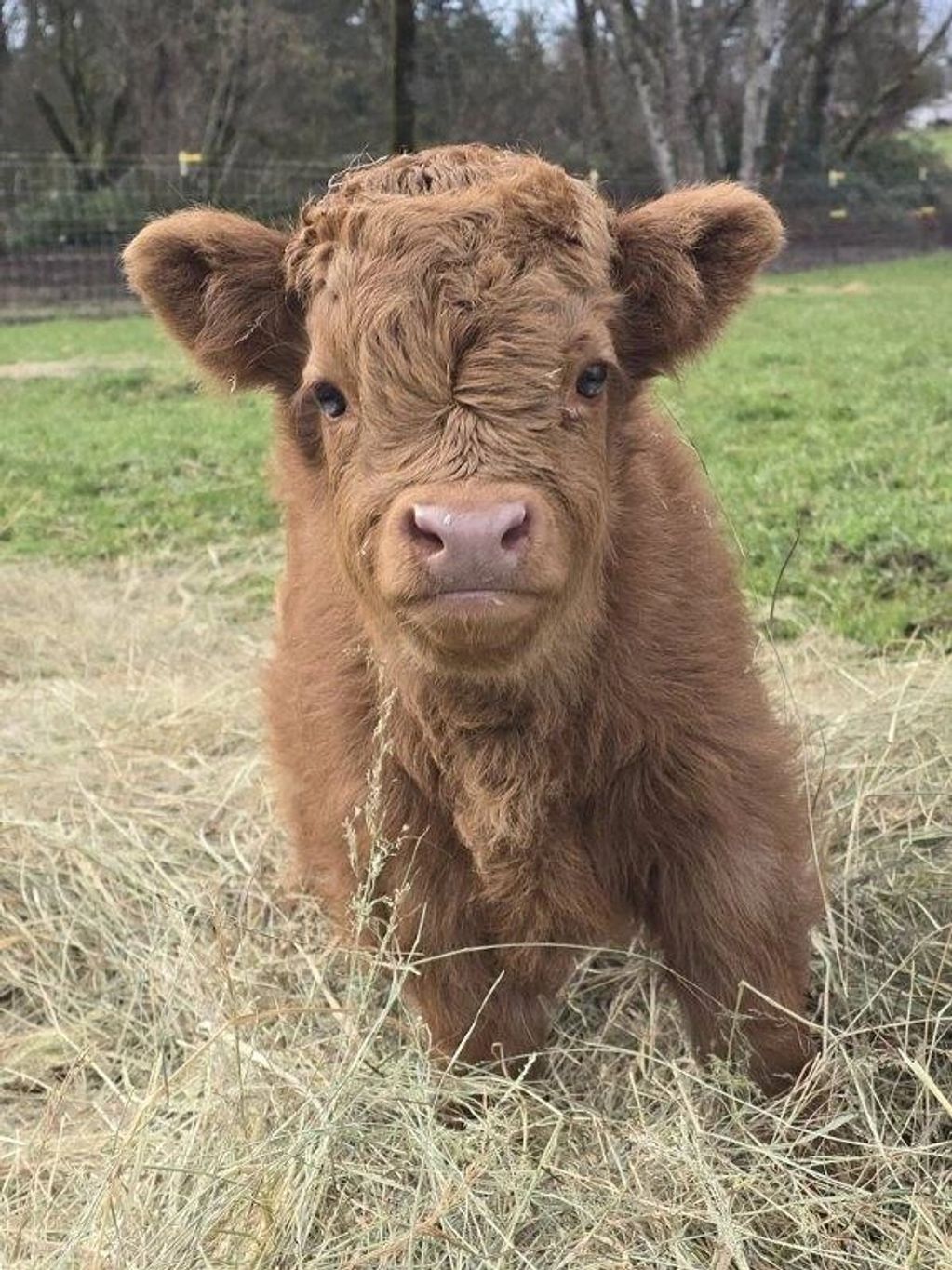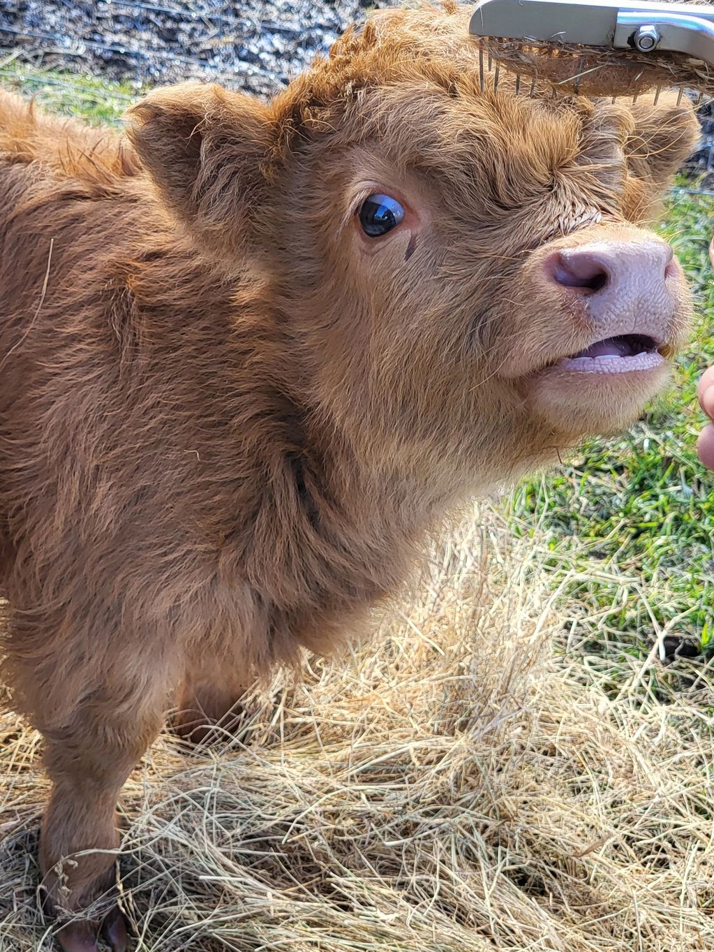 Meet Freddy! This lil guy started our 2026 calving season with a bang! Freddy is a chondro positive yellow highland bull calf. DOB 12/31/25. He was approx 19" at birth. He will mature in the mini range. Dam is Gertie 44" yellow highland. Sire is Hank 38" yellow brindle chondro positive highland bull. Freddy looks red now but will shed out to yellow, carries wild type gene. Everyone needs a little